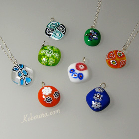 カット済みのベネチアン板ガラスとお花模様のミルフィオリを使って、ペンダントやストラップを2点作ります。 板ガラスの色、ミルフィオリの模様はいろいろご用意していますので、お好みに応じて組み合わせることができます。 2点同じデザインで作って、ピアスやイヤリングにすることもできます。 当日お持ち帰りいただけます。